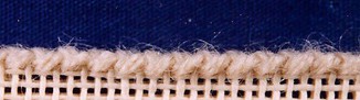 With the wrong side of the canvas toward you, bring the needle, threaded with the correct strands in the needle, up at A. Go over the canvas and enter at B. (red line) Whip the needle away from you and enter at C, then at D. (blue line) Do this until you have reached the end of the area you want to bind. You can bind around a box without stopping the pattern. With a little practice, you should become quite proficent.